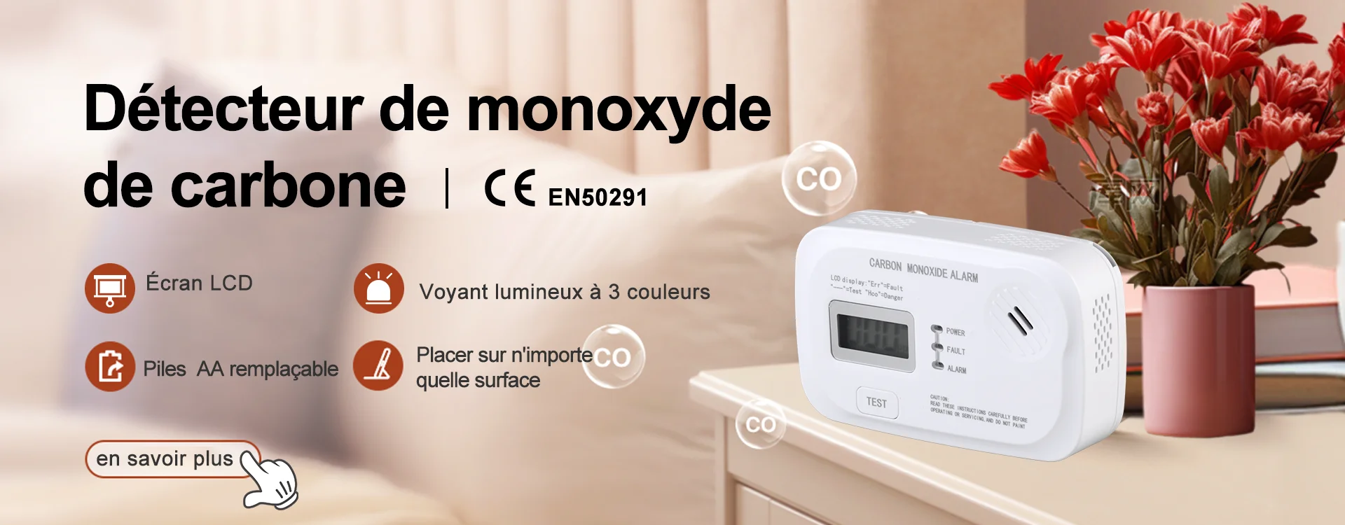 Muet à un bouton en cas de fausse alarme pour éviter des problèmes inutiles ; Fonction de test à un bouton, pratique pour détecter l’état de l’alarme à tout moment.