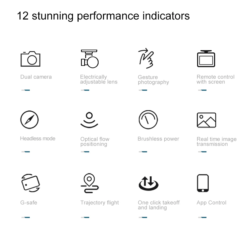 Fonctions : haut/bas, avant/arrière, virage à gauche/droite, vol latéral, lumière LED, mode sans tête, positionnement du flux optique, mode maintien de l’altitude, WiFi FPV, tumbling, affichage indépendant.