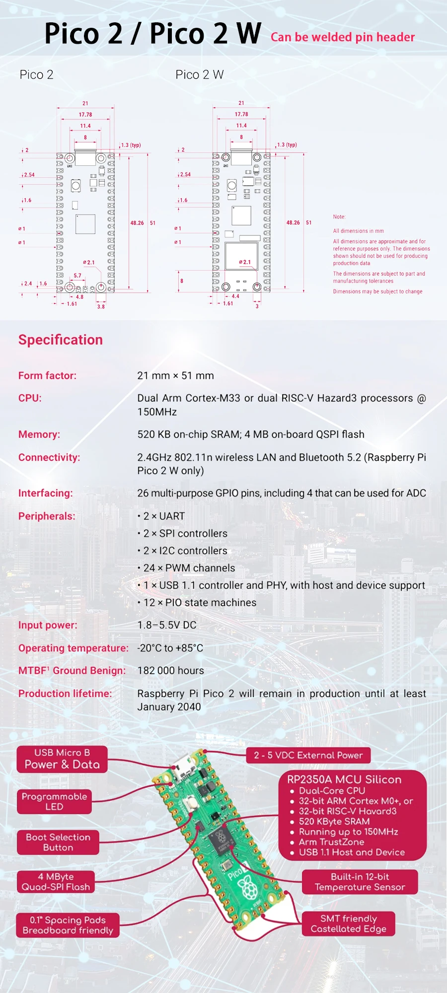 - Wireless: Pico 2 W add 2.4GHz 802.11n Wireless LAN